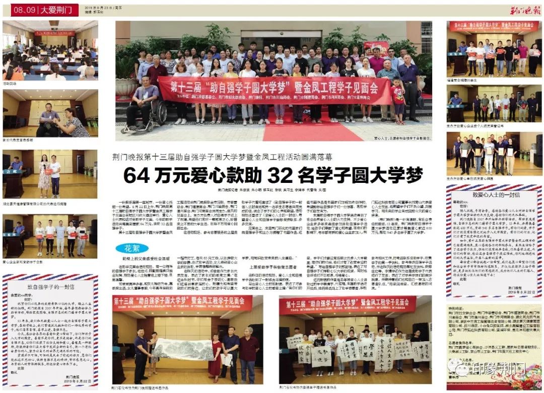 《荊門晚報(bào)》是一份有溫暖、有社會(huì)責(zé)任的報(bào)紙,13年來(lái),荊門晚報(bào)助自強(qiáng)學(xué)子圓大學(xué)夢(mèng)活動(dòng)已累計(jì)籌集愛(ài)心款近600萬(wàn)元,幫助540多名學(xué)子圓了大學(xué)夢(mèng)。