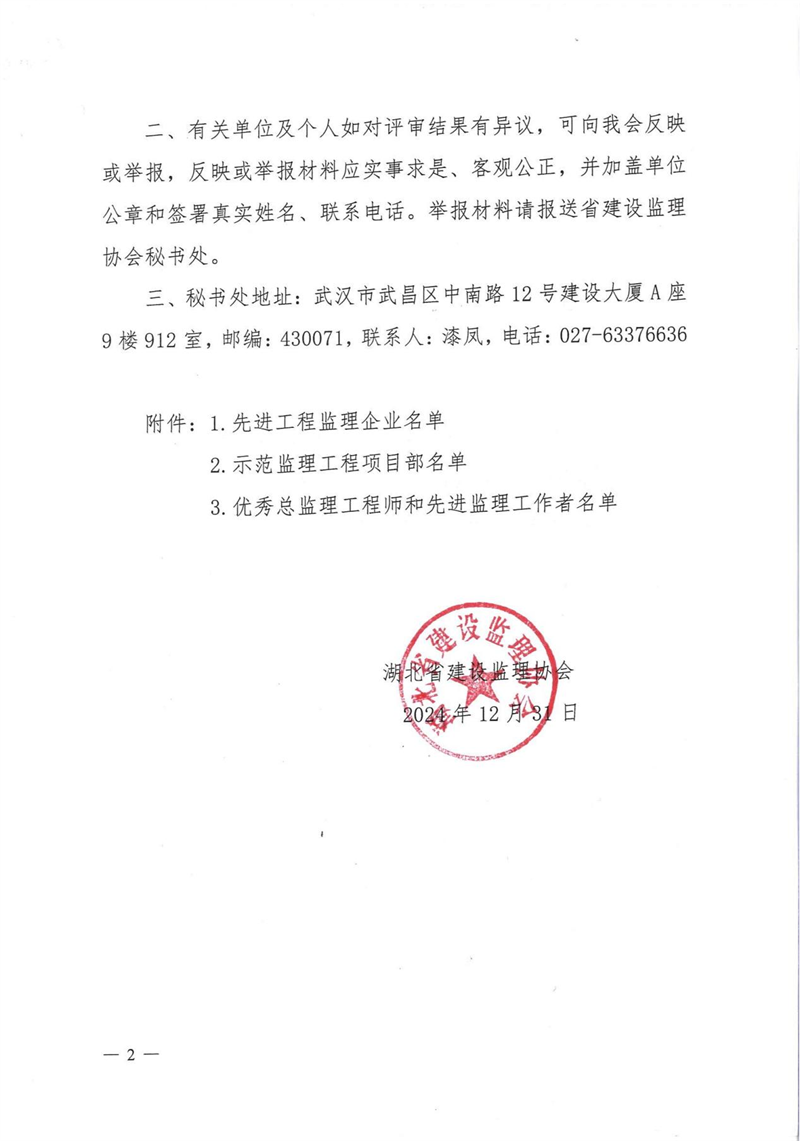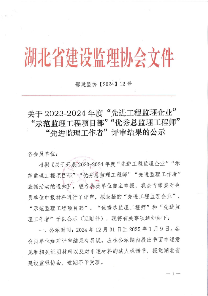 關(guān)于2023-2024年度“先進(jìn)工程監(jiān)理企業(yè)”“示范監(jiān)理工程項(xiàng)目部”“優(yōu)秀總監(jiān)理工程師”“先進(jìn)監(jiān)理工作者”評(píng)審結(jié)果的公示