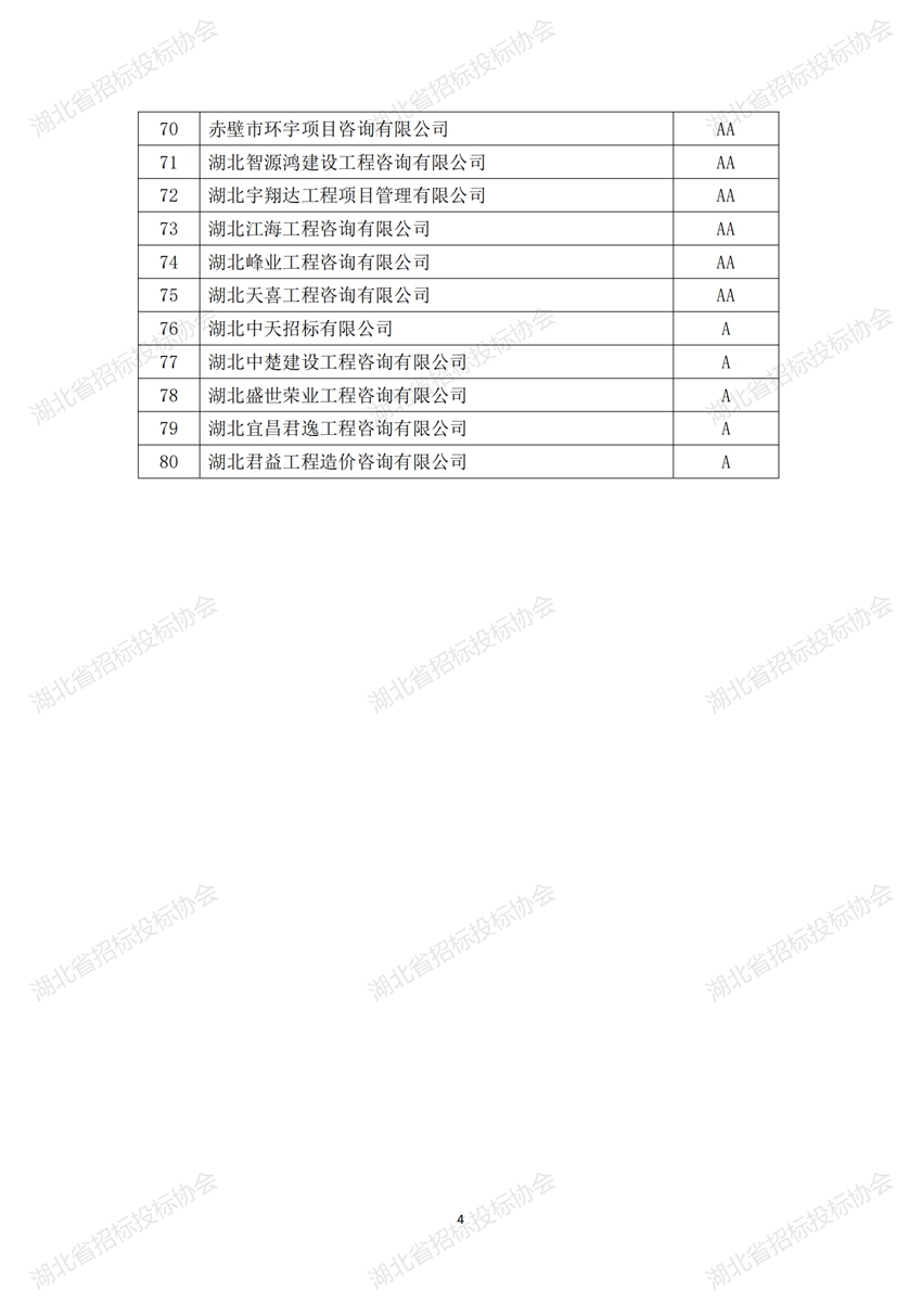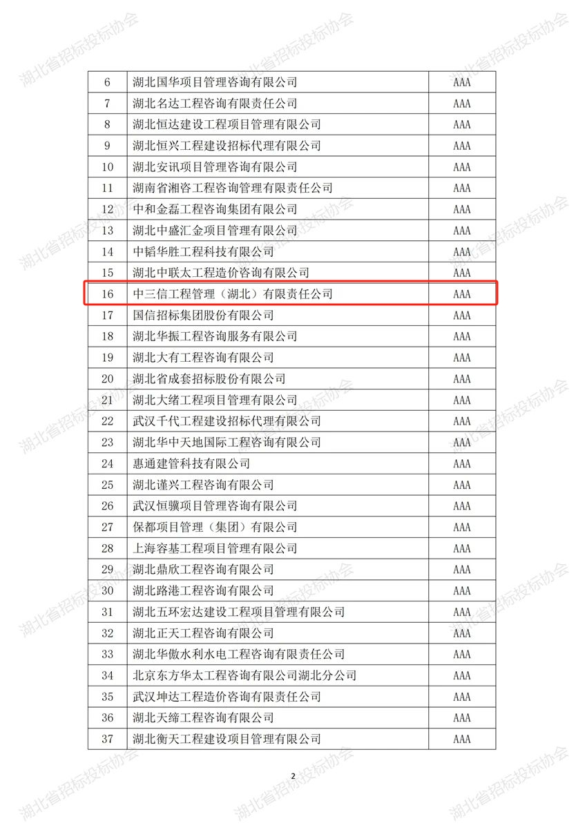 根據《湖北省招標采購代理機構誠信創(chuàng)優(yōu)評級實施辦法》的有關規(guī)定,我會開展了2023年度湖北省招標代理機構誠信創(chuàng)優(yōu)評級活動。經企業(yè)申報、地方協(xié)會審核推薦、組織評審專家初評、復評,公示期申訴、復核,現(xiàn)將評級結果予以公告。